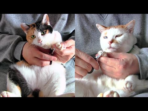 猫の爪切り 三毛猫とオッドアイ猫